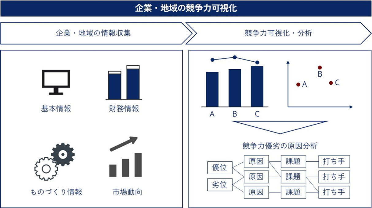 本プロジェクトでは、地域産業全体の競争力を明確化し、金融機関の融資・営業活動の高度化を支援するために多層的なアプローチを取りました。以下に主要な実施内容を整理します。