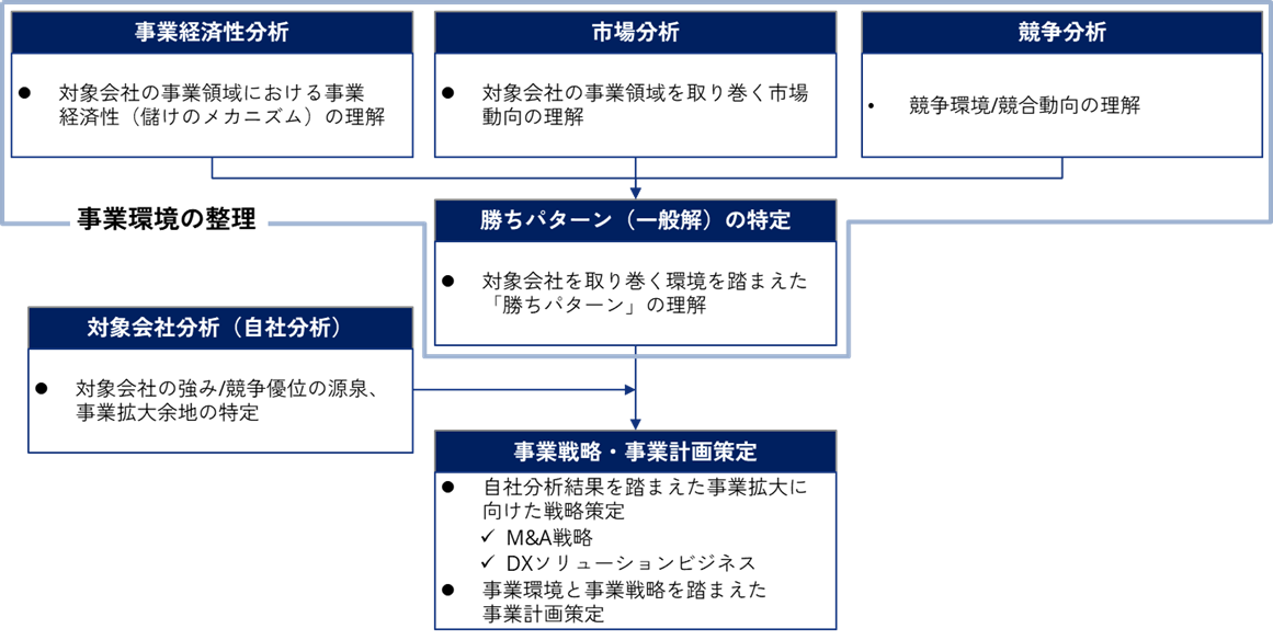 本プロジェクトでは、初めに事業環境を整理することで勝ちパターンを特定し、対象会社の強みを活かした事業戦略を策定しました。プロジェクトの主な実施内容としては以下が挙げられます。
